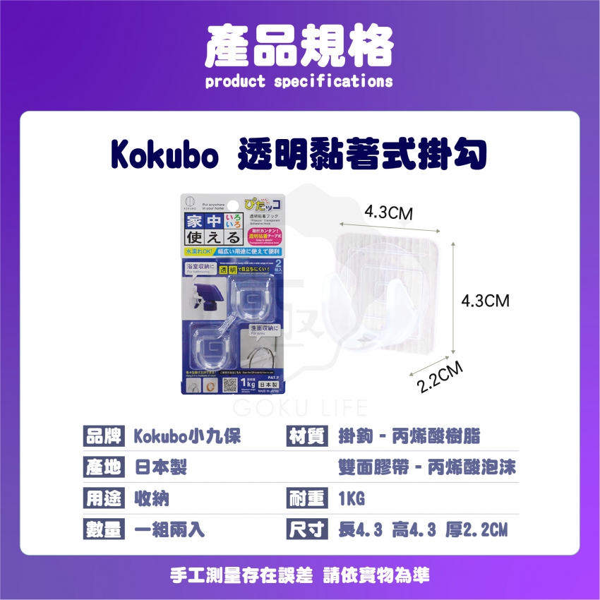 材質: 掛鉤–丙烯酸樹脂、雙面膠帶–丙烯酸泡沫